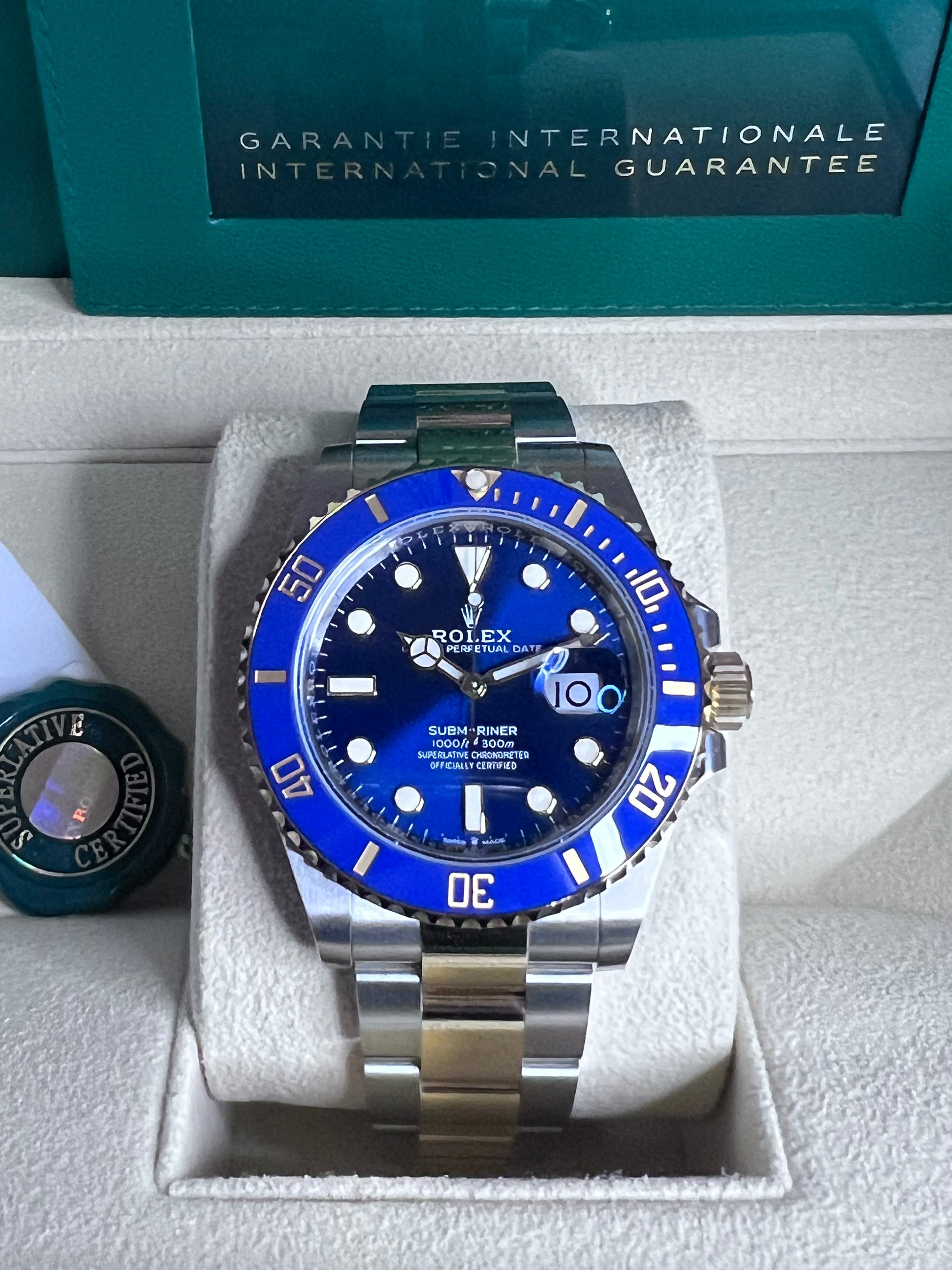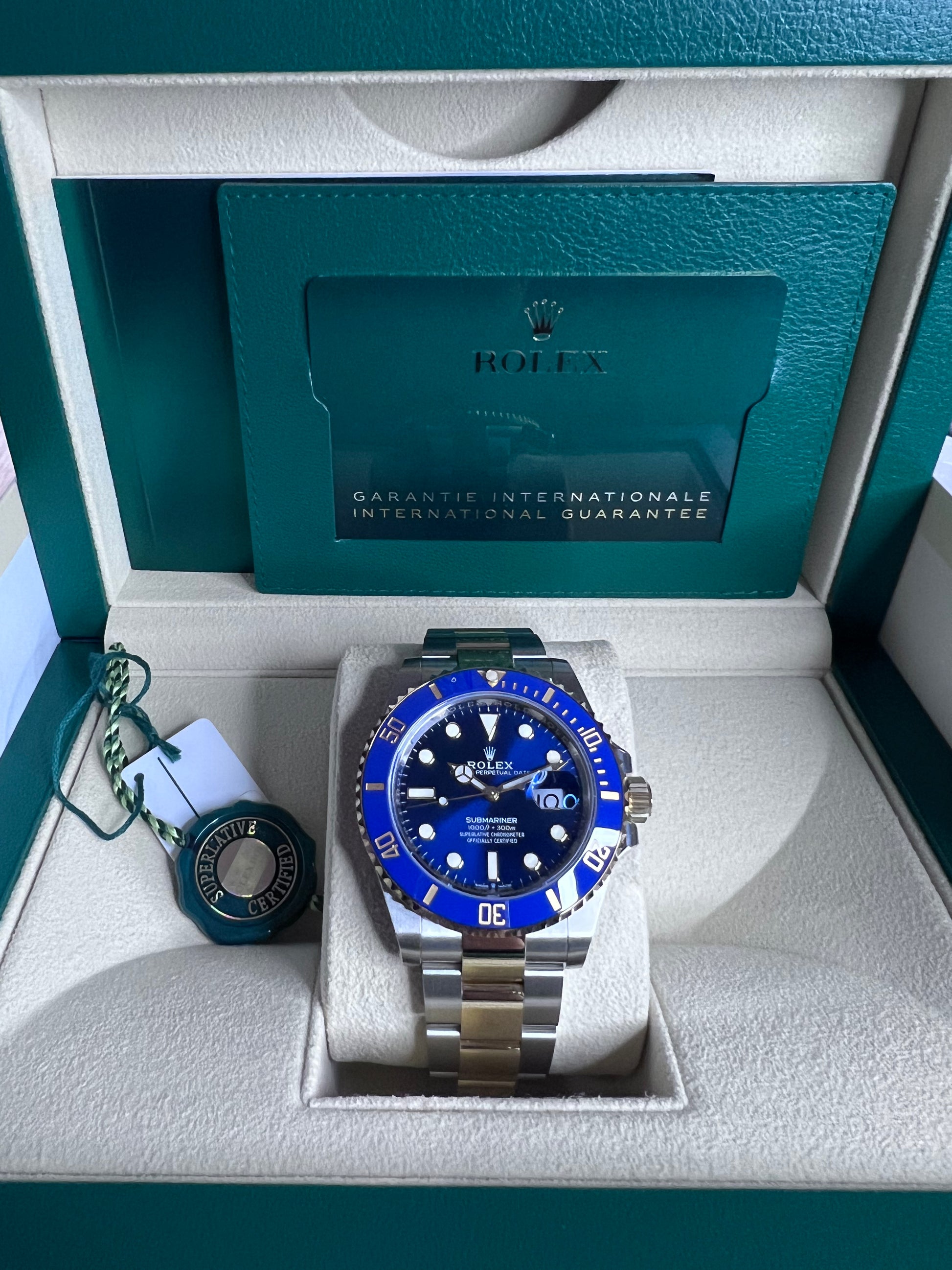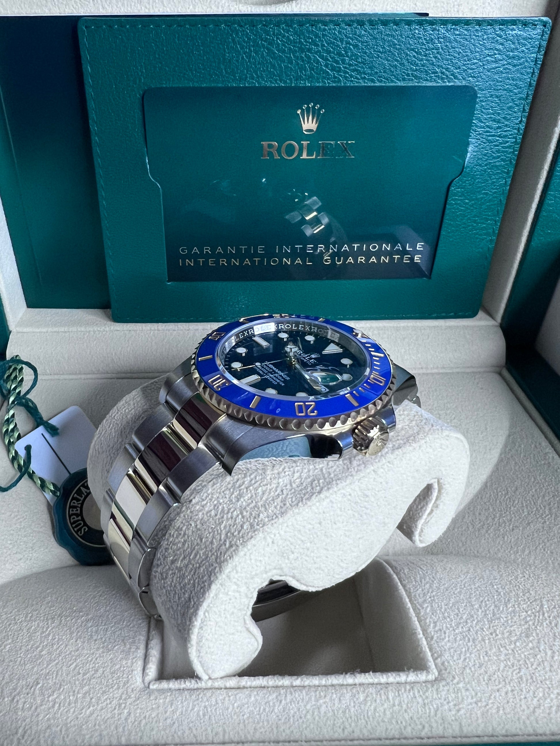 This watch comes with a Rolex box, user manual, warranty booklet, leather Rolex wallet, green chronometer hang tag and the white tag